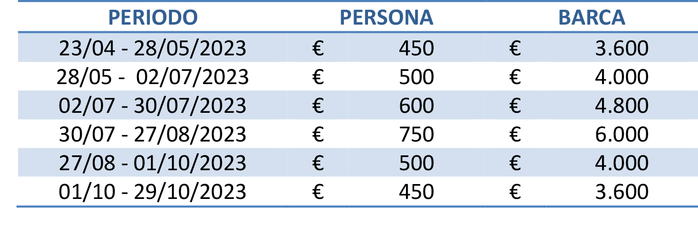 I prezzi indicati sono riferiti a crociera di una settimana che troverete elencate nel dettaglio nella pagina “Crociere in barca a vela“. Per ciò che non è espressamente descritto o per durate differenti vi preghiamo di contattarci tramite mail o con un messaggio attraverso la pagina “Contatti“.